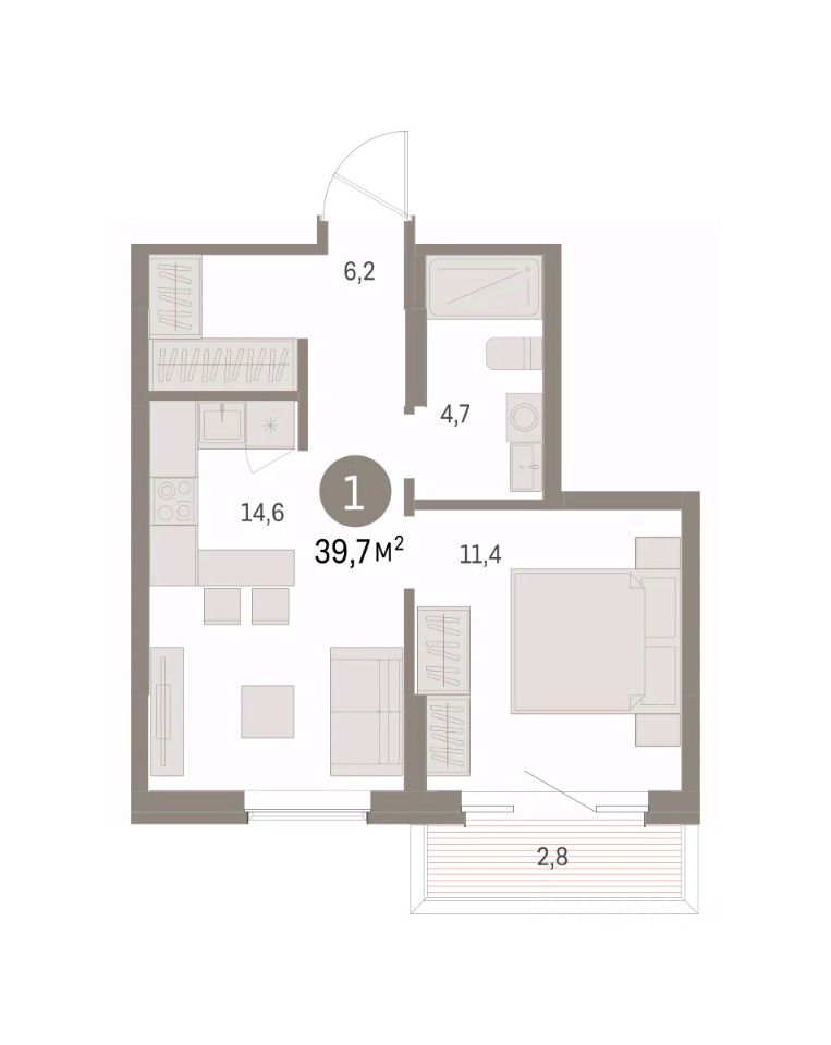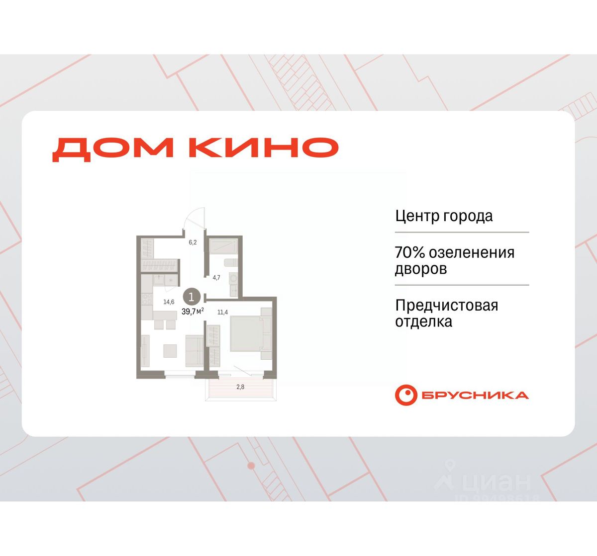 1-комн. квартира от застройщика с предчистовой отделкой в ЖК ''Дом Кино'' на 2 этаже. Общая площадь: 39.66 кв.м., жилая: 11.4 кв.м., площадь просторной кухни-гостиной: 14.6 кв.м. Все окна выходят на одну сторону. В квартире один балкон, один совмещенный санузел. Высота потолков 2.7 м.