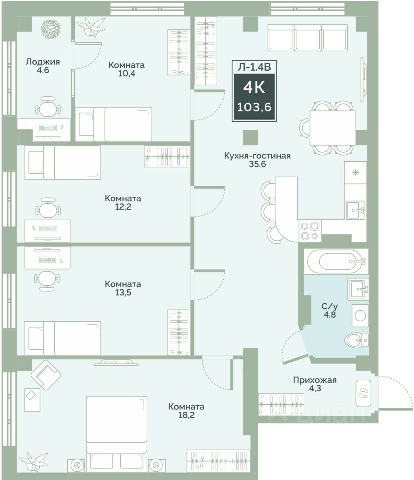 Квартира с предчистовой отделкой, с продуманной функциональной планировкой: кухня-гостиная 35.6 м2, жилая площадь 54.3 м2, высота потолка 2,76 м.