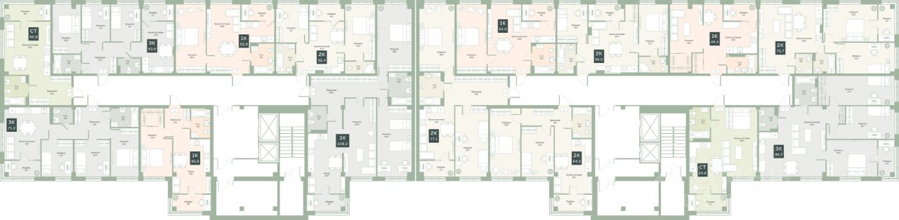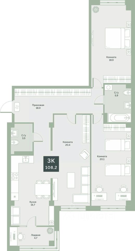 Квартира с предчистовой отделкой, с продуманной функциональной планировкой: кухня-гостиная 16.7 м2, жилая площадь 59.4 м2, высота потолка 2,76 м.