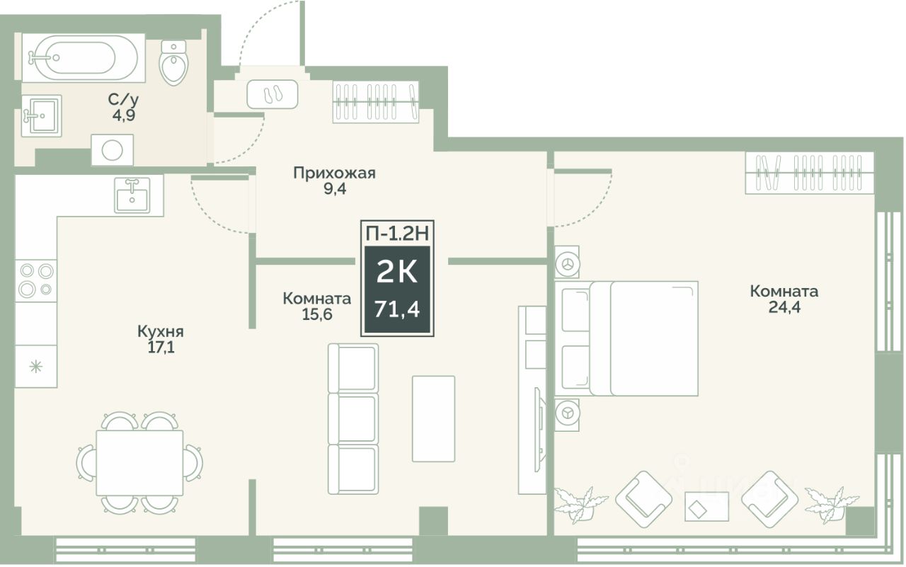 Квартира с предчистовой отделкой, с продуманной функциональной планировкой: кухня-гостиная 17.1 м2, жилая площадь 40 м2, высота потолка 2,76 м.