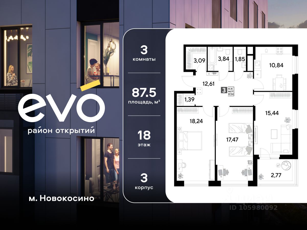 Продается трекомнатная квартира 87.54 кв.м. в жилом комплексе EVO на 18 этаже по адресу: Московская область, г. Реутов, ул. Комсомольская. Скидка до 15% на пул квартир до 15 декабря!* EVO - проект комфорт-класса от девелопера Dogma. Каждый житель сможет открыть для себя максимум возможностей. Совершенствоваться во всех направлениях: физическом, эмоциональном и материальном. В EVO можно открыть для себя новые виды спорта, найти единомышленников по хобби, партнеров по бизнесу, развивать в детях новые грани, наслаждаться природой и лаконичной архитектурой.